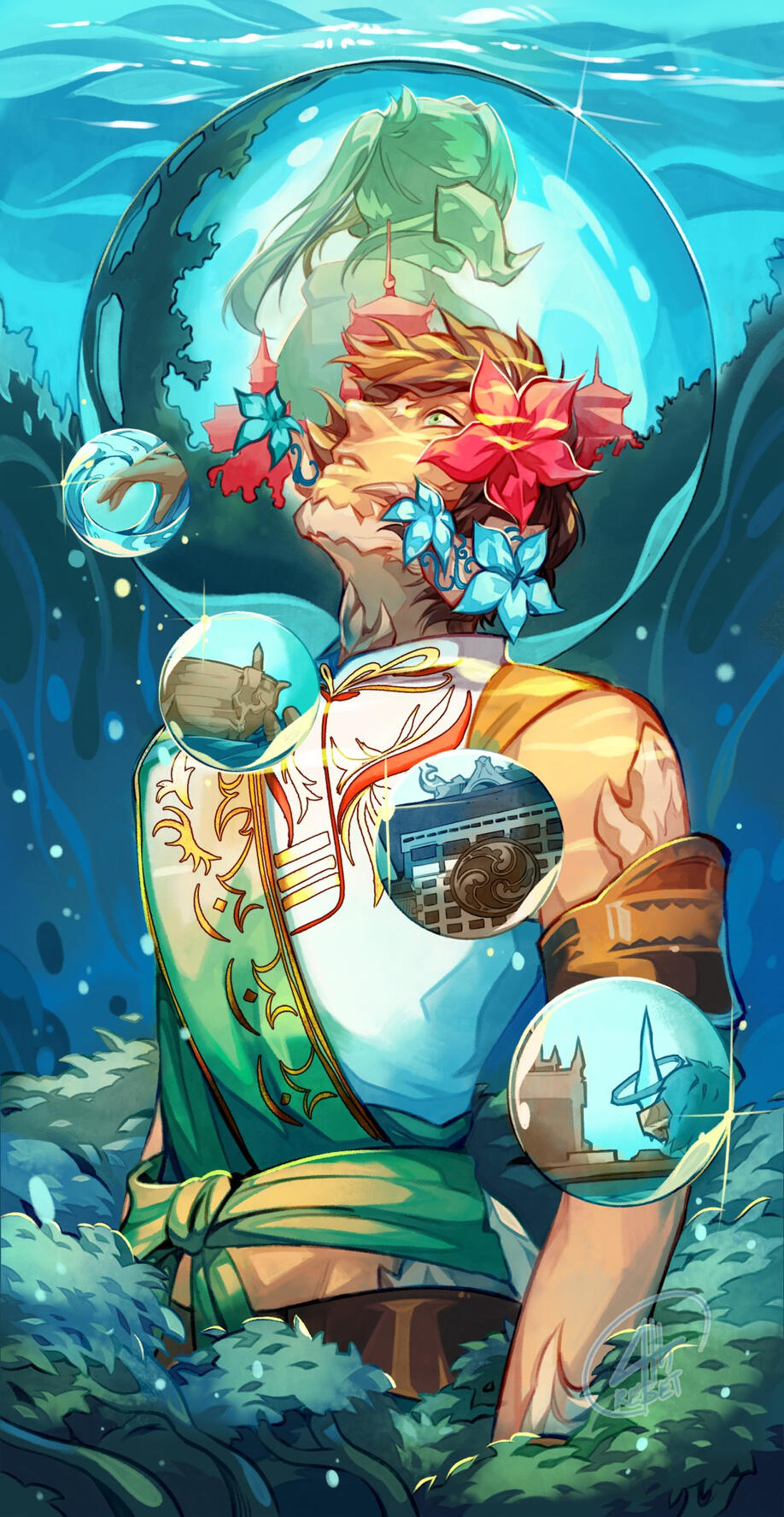 Sollus was born beneath the waves of the Ruby Sea, in the small raen village of Sui-no-Sato. From a young age, he showed an innate aptitude for geomancy, specifically that of manipulating and controlling water. He could hear the elements speak to him in faint whispers and with gentle waves of emotion that he seemed to be more in tune with than any of his peers. Given the location of his home, his skills meant he could be a valuable member of his community, and he found no shortage of support. In just a few short years he soon became the youngest Wavespeaker in the history of his people, honored by the Ruby Princess herself, praised as a prodigy, and expected to become a future leader of his community. While the future certainly looked bright from the outside, the mounting responsibility and weight of the expectations put upon him started to take their toll.The only person Sollus could confide in was his childhood friend Shiosai, another talented wavespeaker. They shared similar pressures...as well as a bed every now and then. Over time though, they started to drift apart. Sollus began to resent his talents and the expectations it brought upon him, while Shiosai took it as his duty to be the next high priest of Sui-no-Sato. Sollus was happy to be free of at least that expectation, but he could not shake a growing restlessness...an unease that just would not leave him.Similar to his peers, Sollus was raised with a fear and mistrust of the surface, believing it to be a corrupt and warlike place which harbored only death and misery. Despite this, He often found himself looking toward it. Through the waters around his home he watched the bottoms of the Confederacy's ships sailing overhead, and the washed out glowing orb of the sun traveling across the sky. He felt something inside of him that his family and friends could not relate to...a desire that was so taboo in his society, that it took him a while to even find the right words for this craving...Sollus had the need for adventure...Almost as if sensing the raen's desire, he began to hear a faint whisper almost daily. It was quiet, but insistent. His fellow Wavespeakers could not hear it, but he knew that whatever it was, it needed help. He begged the High Priest to allow him to seek it out beyond the Ruby Sea, but the elder denied him, saying if he left he would not be allowed to return, as was the well known rule for any who left Sui-no-Sato. His friends and family insisted that the pleading whisper had to be nothing more than the manifestation of Sollus's wanderlust, and he should focus on his duties instead, but no matter what, the desperate whisper continued unabated.